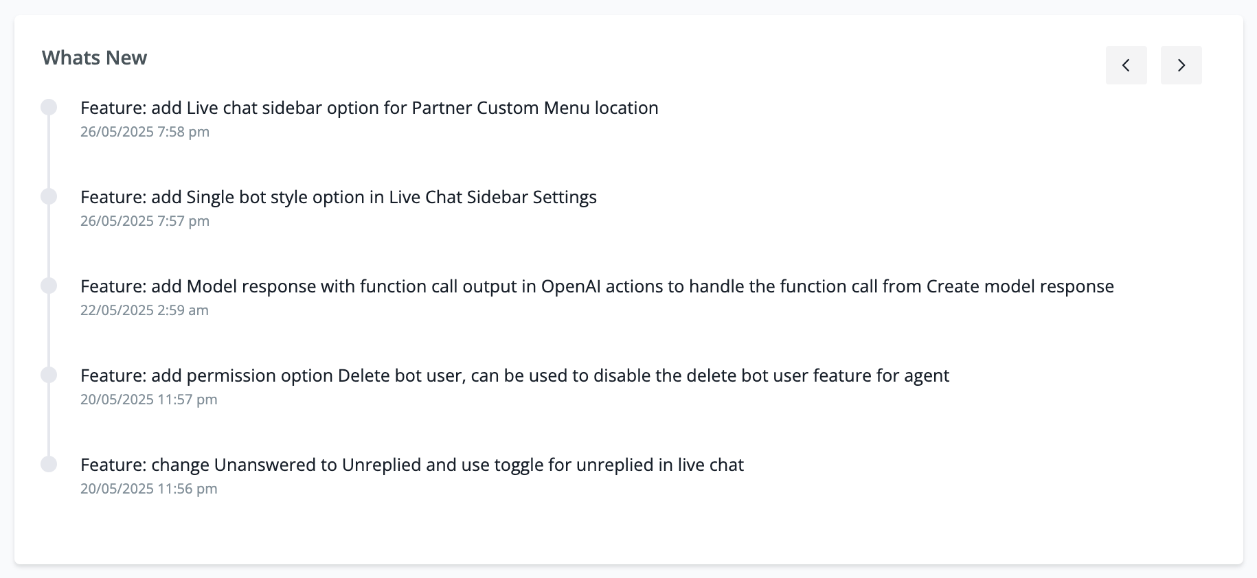Los últimos cambios de OneChat se pueden ver desde el dashboard principal (https://app.onechat.co) en la parte inferior derecha con el título "Que hay de nuevo".